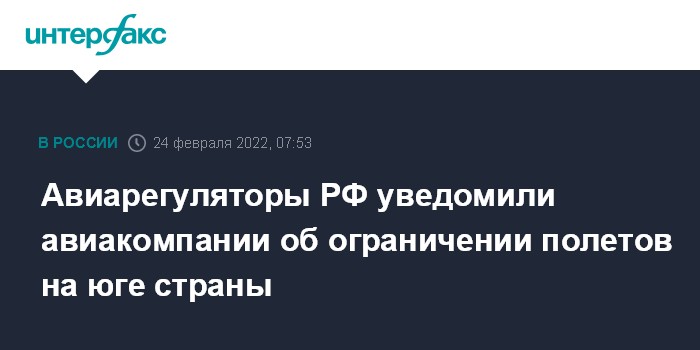 Москва. 24 февраля. INTERFAX.RU - Авиарегуляторы РФ уведомили авиакомпании об ограничении полетов на юге страны в связи с ситуацией на Украине, следует из NОТАМ (от англ. NOtice To AirMen, извещение летному составу), с копией которого ознакомился "Интерфакс".