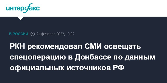 "Роскомнадзор информирует средства массовой информации, информационные ресурсы, что при подготовке своих материалов и публикаций, касающихся проведения специальной операции в связи с ситуацией в Луганской народной республике и Донецкой народной республике, они обязаны использовать информацию и данные, полученные ими только из официальных российских источников", - говорится в сообщении РКН.