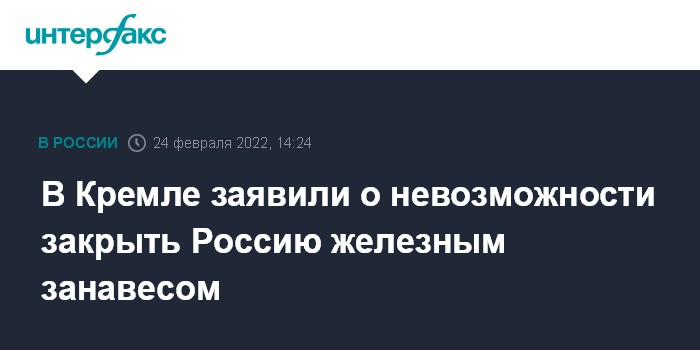"Такая страна как Россия не может оказаться за железным занавесом. Безусловно, у нас могут возникнуть проблемы с целым рядом государств, но так или иначе у нас с этими государствами проблемы возникали и до этого, и без этого. Но такую страну как Россия закрыть железным занавесом просто невозможно", - сказал Песков, отвечая на вопрос о том, как в Кремле оценивают риски того, что после начала спецоперации в Донбассе Россия окажется за железным занавесом.