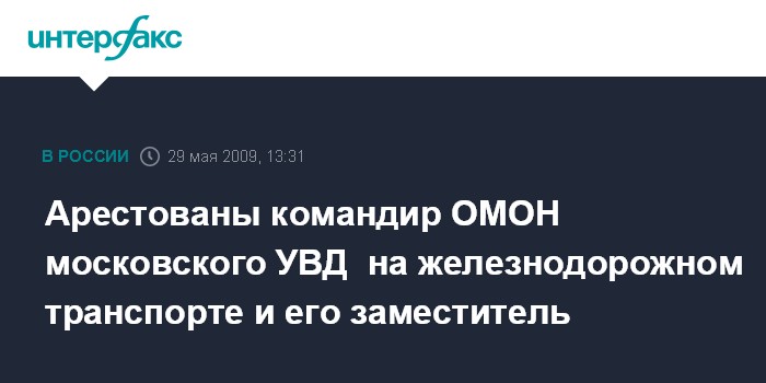 Москва. 29 мая. INTERFAX.RU - Арестованы командир ОМОН московского управления внутренних дел на железнодорожном транспорте МВД России Анатолий Сивокоз и его заместитель.