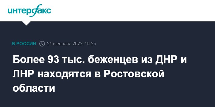 Москва. 24 февраля. INTERFAX.RU - Более 93 тысяч беженцев из Луганской и Донецкой народных республик размещены в пунктах временного содержания в Ростовской области, сообщил секретарь Генсовета "Единой России" Андрей Турчак.