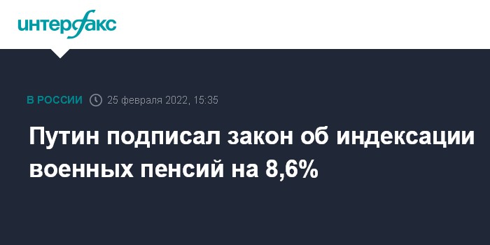 Москва. 25 февраля. INTERFAX.RU - Президент России Владимир Путин подписал закон об индексации пенсий военным пенсионерам на 8,6% с 1 января 2022 года.