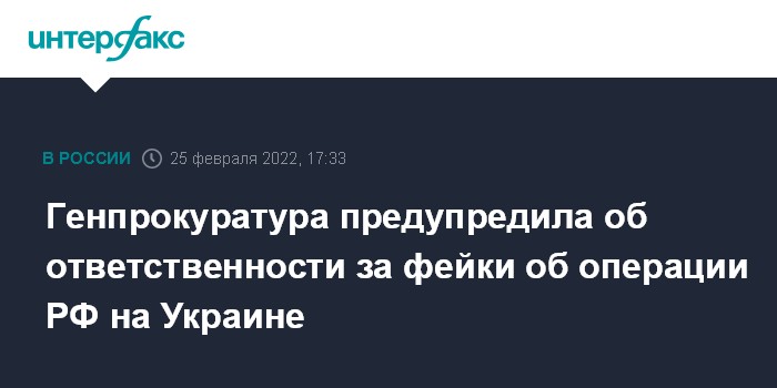 Москва. 25 февраля. INTERFAX.RU - Генпрокуратура России предупредила об ответственности за распространение фейков о событиях, связанных с проведением специальной операции России по защите ДНР и ЛНР.