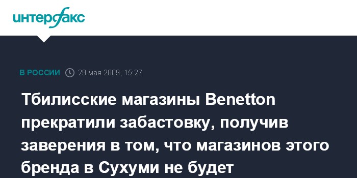 Москва. 29 мая. INTERFAX.RU - В Тбилиси в пятницу возобновили работу магазины сети известной итальянской фирмы Benetton, которые во вторник закрылись в знак протеста против того, что турецкие партнеры компании собирались открыть магазин этого бренда в Сухуми без согласия грузинской стороны.