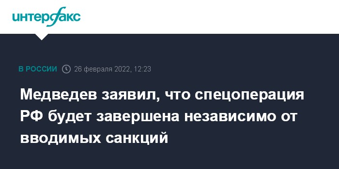Москва. 26 февраля. INTERFAX.RU - Военная операция по защите Донбасса будет проведена в полном объеме и до достижения всех результатов, а вводимые Западом санкции ничего не изменят, заявил замглавы Совбеза РФ Дмитрий Медведев.
