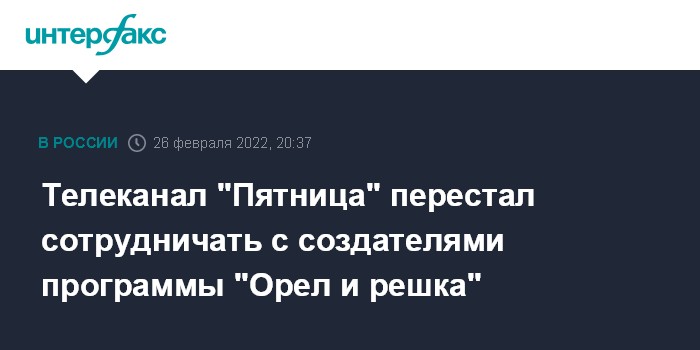 Москва. 26 февраля. INTERFAX.RU - Телеканал "Пятница!" (входит в холдинг "Газпром-медиа) прекратил сотрудничество с украинской компанией TeenSpirit, который производит проект "Орел и решка".