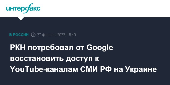 РКН потребовал от Google восстановить доступ к YouTube-каналам СМИ РФ на Украине