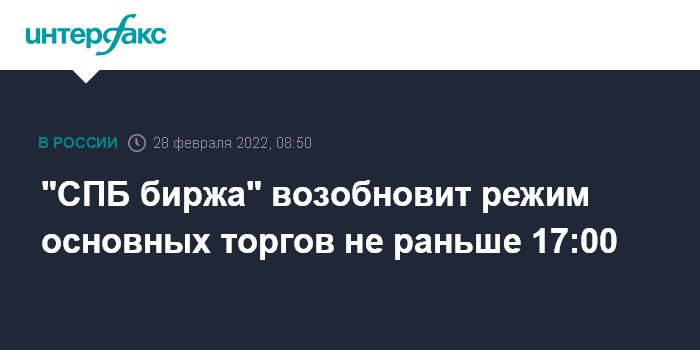 "СПБ биржа" возобновит режим основных торгов не раньше 17:00