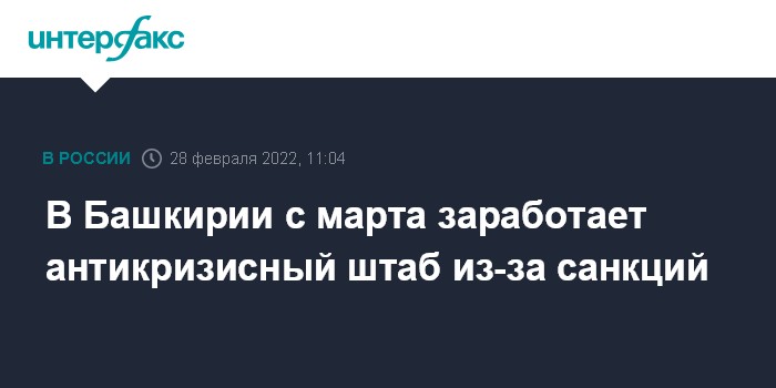 Москва. 28 февраля. INTERFAX.RU - В Башкирии с 1 марта начнет работу антикризисный штаб, сообщил на оперативном совещании в правительстве республики премьер-министр региона Андрей Назаров.