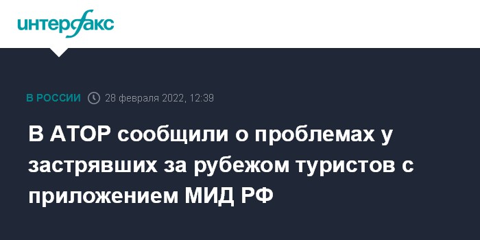 Москва. 28 февраля. INTERFAX.RU - Застрявшие за пределами России из-за закрытия воздушного сообщения российские туристы из-за сбоев в работе не могут зарегистрироваться в приложении "Зарубежный помощник" МИД РФ, по информации которого ведомство составляет списки на вывозные рейсы, сообщает Ассоциация туроператоров России (АТОР).