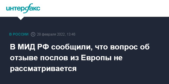 Москва. 28 февраля. INTERFAX.RU - Россия не рассматривает возможность отзыва послов из европейских стран или представителя РФ при ЕС, сообщил замглавы МИД РФ Евгений Иванов.