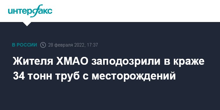 Москва. 28 февраля. INTERFAX.RU - В Ханты-Мансийском автономном округе задержан житель Мегиона, подозреваемый в краже в общей сложности 34,176 тонны металлических труб на месторождении, сообщает межмуниципальный отдел МВД "Нижневартовский".