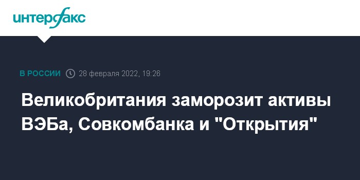 Великобритания заморозит активы ВЭБа, Совкомбанка и "Открытия"