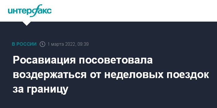 Москва. 1 марта. INTERFAX.RU - Росавиация рекомендовала россиянам "воздержаться от поездок неслужебного характера в зарубежные страны в ближайшее время". Этот и другие советы опубликовала пресс-служба ведомства.