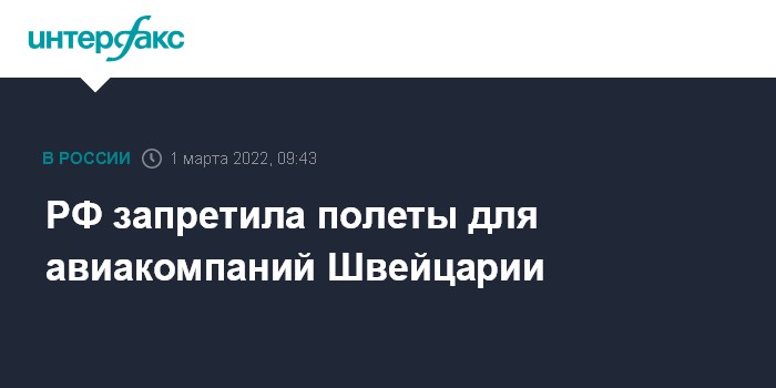 Вчера, 28 февраля, в соответствии с нормами международного права в качестве ответной меры на запрет Швейцарии на полеты гражданских воздушных судов, эксплуатирующихся российскими авиаперевозчиками и/или зарегистрированных в России, введено ограничение на полеты гражданских самолетов, эксплуатирующихся и/или зарегистрированных в Швейцарии, сказано в сообщении.