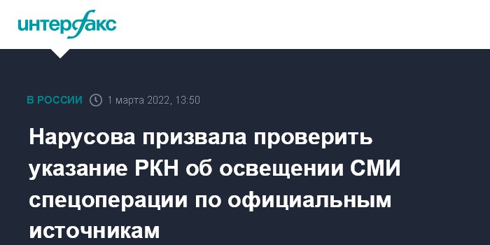 Москва. 1 марта. INTERFAX.RU - Сенатор Людмила Нарусова предложила выяснить в Роскомнадзоре, не противоречит ли законодательству его заявление о том, что российские СМИ обязаны при освещении военной спецоперации на Украине пользоваться только информацией из официальных источников РФ.