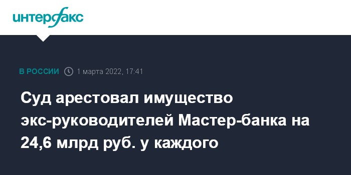 Суд арестовал имущество экс-руководителей Мастер-банка на 24,6 млрд руб. у каждого