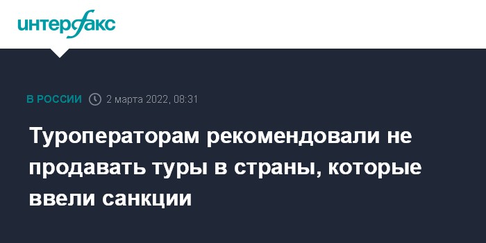 Москва. 2 марта. INTERFAX.RU - Ростуризм "в связи со сложившейся ситуацией" рекомендовал россиянам отказаться от поездок в страны, которые ввели санкции против России, а туроператорам - приостановить продажи туда туров, сообщила пресс-служба ведомства.