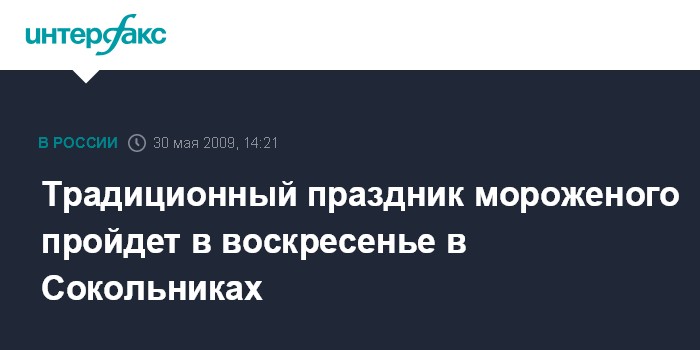 Москва. 30 мая. INTERFAX.RU - Традиционный, 13-й по счету, праздник мороженого пройдет в воскресенье, 31 мая, в парке культуры и отдыха "Сокольники", сообщили "Интерфаксу" в Союзе мороженщиков России.