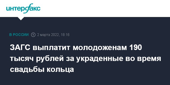 ЗАГС выплатит молодоженам 190 тысяч рублей за украденные во время свадьбы кольца