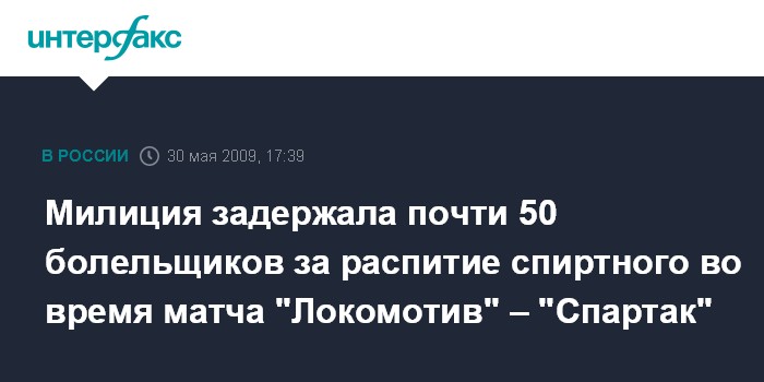 Москва. 30 мая. INTERFAX.RU - Во время матча чемпионата России по футболу между командами "Локомотив" и "Спартак" в субботу на стадионе "Локомотив" за нарушение общественного порядка было задержано 49 человек.