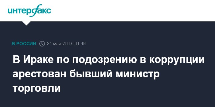 Москва. 31 мая. ИНТЕРФАКС - В Багдаде по подозрению в коррупции арестован при попытке покинуть страну бывший министр торговли Ирака Абдул Фалах Судани.