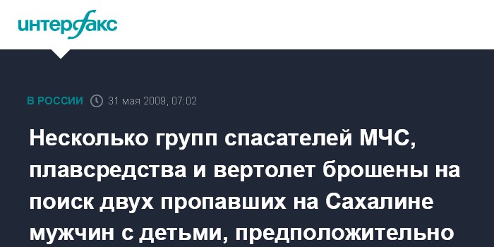 Как сообщили агентству "Интерфакс - Дальний Восток" в координационном морском спасательном подцентре "Южно-Сахалинск", в субботу поздно вечером оперативному дежурному ГУ МЧС позвонила жительница Южно-Сахалинска. "Женщина рассказала, что ее сын и его знакомый с двумя детьми выехали в район села Лесное Корсаковского района отдохнуть и порыбачить на реке Очепуха. Вечером сын перезвонил ей по телефону и сказал, что с лодкой что-то случилось, после чего связь прервалась и до настоящего времени не установлена", - рассказал собеседник агентства.