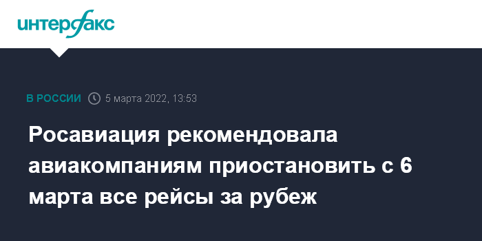 Москва. 5 марта. INTERFAX.RU - Росавиация рекомендует российским авиакомпаниям приостановить с 6 марта все международные рейсы на фоне массовых арестов самолетов за рубежом.