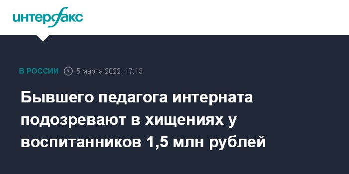 Москва. 5 марта. INTERFAX.RU - В Омске бывшего педагога адаптивной школы-интернета задержали по подозрению в краже у воспитанников их сбережений на общсую сумму более 1,5 млн рублей, сообщила представитель МВД России Ирина Волк. Пострадавшими по делу пока считаются шесть выпускников школы.