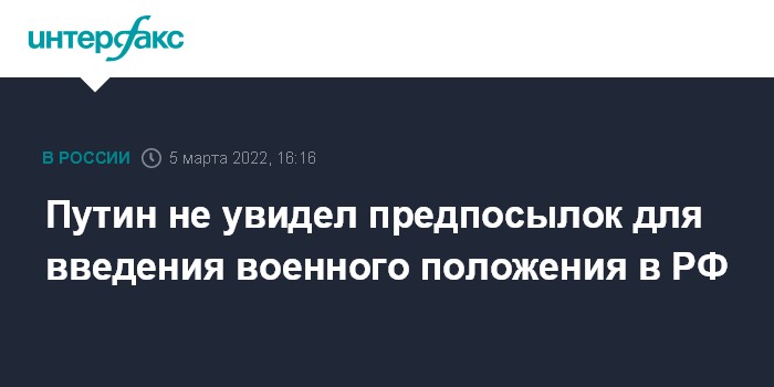 Москва. 5 марта. INTERFAX.RU - В РФ отсутствуют предпосылки для введения военного или какого-либо иного особого положения, таких планов нет, заявил президент Владимир Путин.