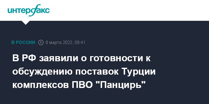 Москва. 6 марта. INTERFAX.RU - Россия готова к продолжению диалога с Турцией о поставках комплексов ПВО ближнего действия "Панцирь" для защиты ранее приобретенных С-400, сообщили "Интерфаксу" в Федеральной службе по военно-техническому сотрудничеству (ФСВТС) РФ.