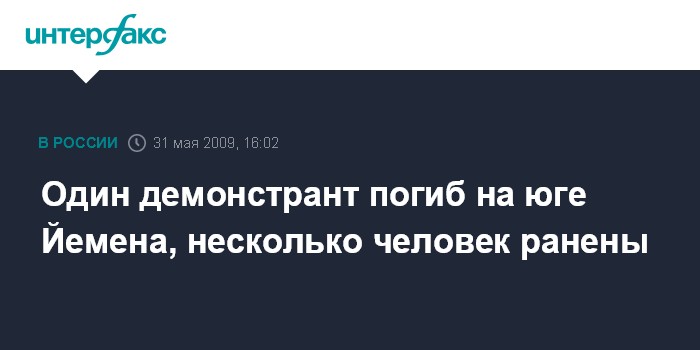 Лондон. 31 мая. INTERFAX.RU - Один человек погиб, еще пять человек получили ранения в ходе столкновений между участниками антиправительственной демонстрации с полицией Иемена, сообщает в воскресенье британская телерадиокорпорация Би-би-си.