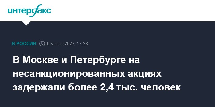 "В городе Москве в несогласованной акции приняли участие около 2500 человек, задержаны 1700. В городе Санкт-Петербурге число участников составило примерно 1500 человек, 750 из них задержаны. В других регионах в несанкционированных мероприятиях приняли участие в общей сложности 1200 человек, задержаны 1061", - сказала Волк журналистам в воскресенье.