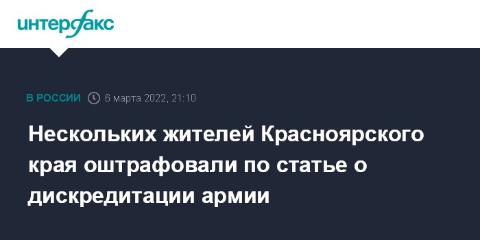 Москва. 6 марта. INTERFAX.RU - Сотрудники полиции в Красноярском крае составили административные материалы в отношении семи граждан за дискредитацию Вооруженных сил РФ, пятеро из них уже оштрафованы, сообщает пресс-служба МВД РФ в воскресенье.