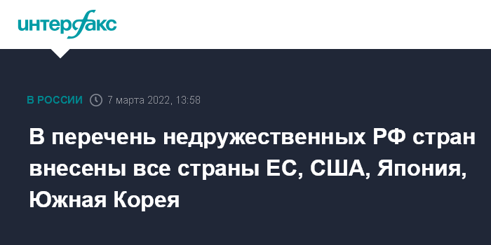 В перечень недружественных РФ стран внесены все страны ЕС, США, Япония, Южная Корея