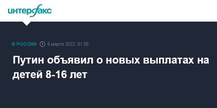 "Считаю, что мы должны принять новое решение, - установить выплаты на детей от восьми до 16 лет включительно, подчеркну, для всех семей с невысокими доходами, поддержать их. Эта мера начнет действовать с 1 апреля, а первые выплаты семьи получат в мае", - заявил Путин.