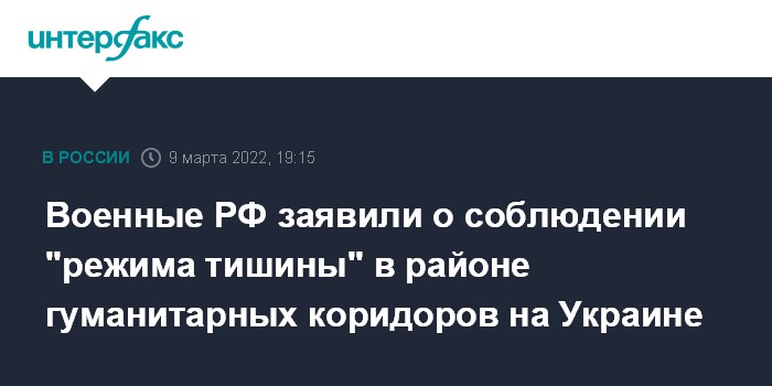 "Сегодня ровно в 10 часов в соответствии с достигнутыми договоренностями на десяти гуманитарных коридорах, инициированных Российской Федерацией, и трех дополнительно по просьбе украинской стороны Вооруженными силами России введены "режимы тишины", которые неукоснительно соблюдаются до настоящего времени", - сказал Мизинцев на брифинге в среду.
