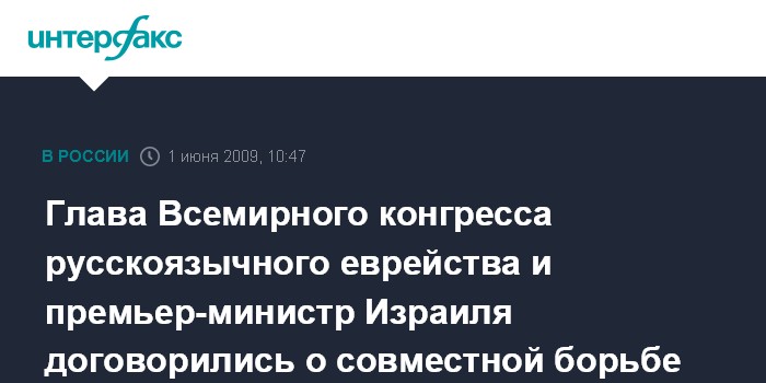 Москва. 1 июня. INTERFAX.RU - В ходе визита в Израиль президент Всемирного конгресса русскоязычного еврейства (ВКРЕ), председатель комиссии Совета федерации по вопросам развития институтов гражданского общества Борис Шпигель встретился с премьер-министром страны Биньямином Нетанияху и обсудил широкий круг вопросов, связанных с взаимоотношением российско-израильских отношений и взаимоотношений русскоязычных евреев и Израиля. В том числе была затронута и тема героизации нацизма и реабилитации пособников фашистов в странах бывшего СНГ. Борис Шпигель рассказал Нетанияху, что Конгресс намерен бороться с данной тенденцией во всех странах, где живут русскоязычные евреи. "В этом вопросе неуместно политиканство и неприемлемы любые попытки придать этой форме безумия малейшую легитимность, - заявил Шпигель. Эта позиция нашла полное понимание у премьер-министра Израиля, который, со своей стороны, отметил, что попытка переписывания истории II мировой войны неприемлема и что данный вопрос будет поставлен на рассмотрение перед правительством Израиля. Борис Шпигель и Биньямин Нетанияху договорились о создании совместной рабочей группы, которая займется подготовкой празднования 65-летия Победы.