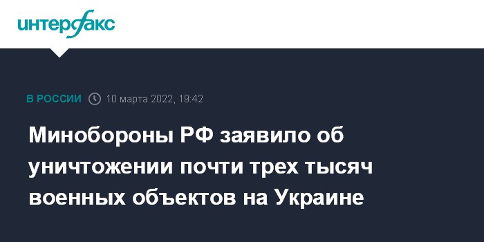 Москва. 10 марта. INTERFAX.RU - Российские военные сообщили об уничтожении почти трех тысяч объектов военной инфраструктуры Украины.
