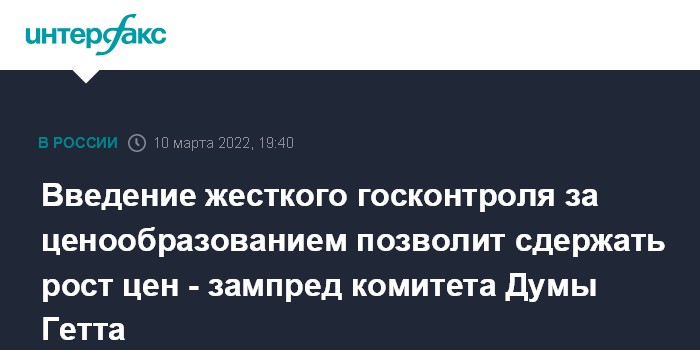 Введение жесткого госконтроля за ценообразованием позволит сдержать рост цен - зампред комитета Думы Гетта