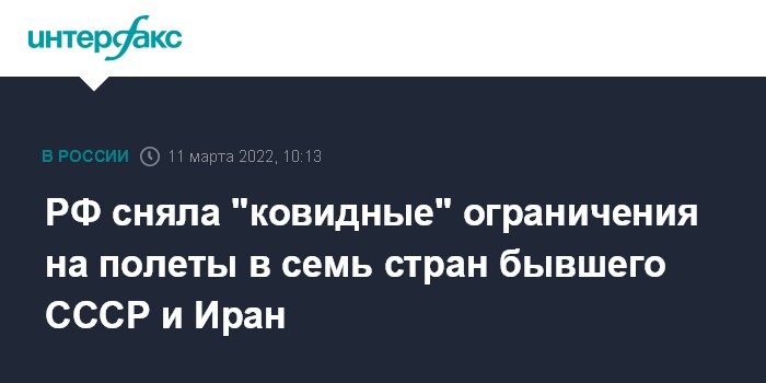 "9 марта 2022 года в соответствии с решением правительства РФ сняты введенные ранее в рамках предотвращения распространения COVID-19 ограничения на нерегулярные и регулярные полеты в Азербайджан, Армению, Казахстан, Киргизию, Таджикистан, Туркменистан, Узбекистан и Иран", - говорится в сообщении ведомства.