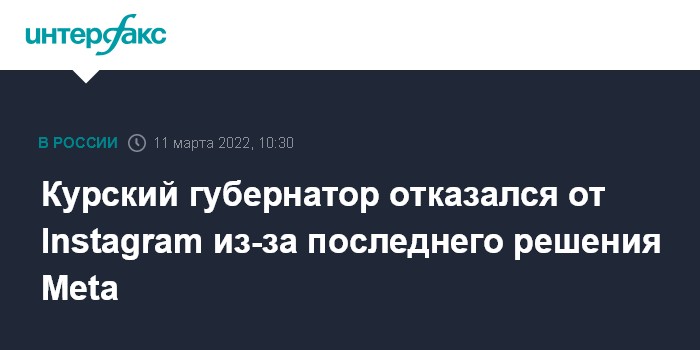 Москва. 11 марта. INTERFAX.RU - Губернатор Курской области Роман Старовойт решил отказаться от Instagram из-за решения Meta разрешить пользователям Facebook и Instagram призывы к насилию в отношении российских военных.