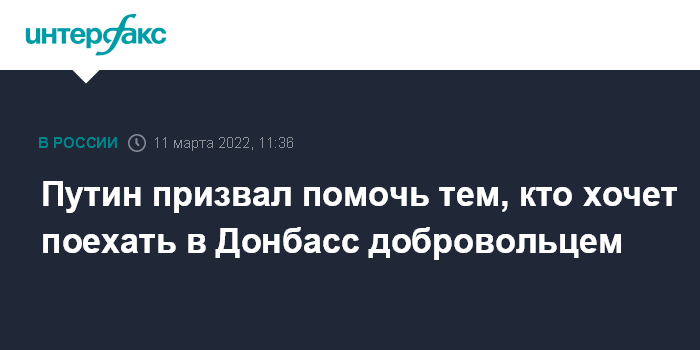 Москва. 11 марта. INTERFAX.RU - Президент РФ Владимир Путин считает возможным направить в Донбасс добровольцев, которые хотят помочь жителям этого региона.