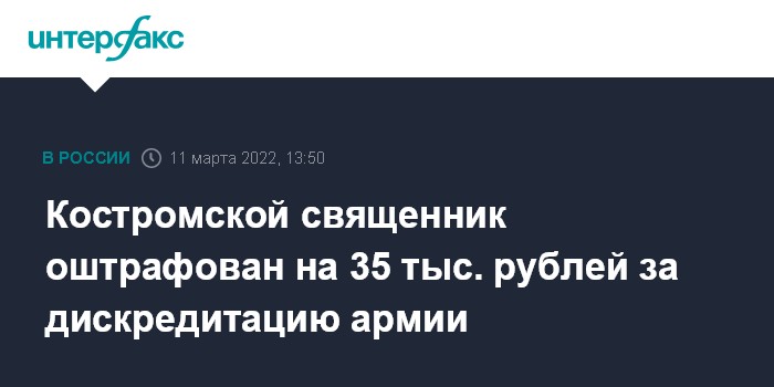 Москва. 11 марта. INTERFAX.RU - Священнику в Костромской области назначили штраф в 35 тысяч рублей за дискредитацию российских военных во время проповеди после богослужения в храме.