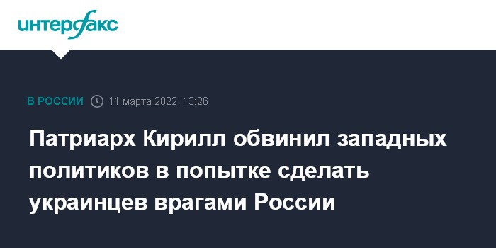 Москва. 11 марта. INTERFAX.RU - Патриарх Московский и всея Руси Кирилл осудил Запад за намерение изменить менталитет жителей Украины, сделать их врагами России, с народом которой они связаны "общей исторической судьбой". Предстоятель РПЦ написал об этом исполняющему обязанности генсека Всемирного совета церквей протоиерею Иоанну Сауке.
