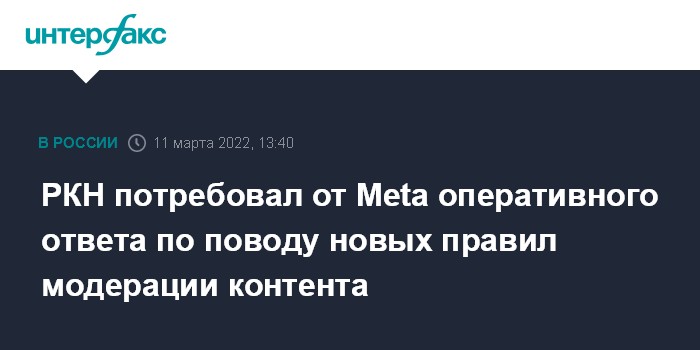 Москва. 11 марта. INTERFAX.RU - Компания Meta должна в кратчайшие сроки подтвердить или опровергнуть изменения правил модерации контента в своих социальных сетях в отношении граждан РФ, в том числе военнослужащих, сообщили в Роскомнадзоре (РКН).