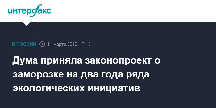 Москва. 11 марта. INTERFAX.RU - Госдума приняла в первом чтении законопроект, который предлагает отложить ряд экологических инициатив из-за внешнего санкционного давления. Документ (№84931-8) накануне внесло в парламент правительство.