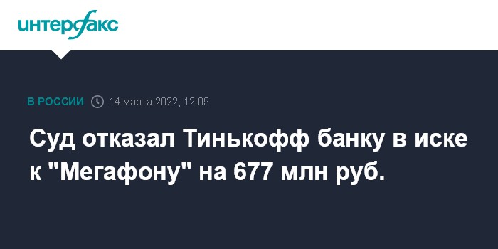 Москва. 14 марта. INTERFAX.RU - Девятый арбитражный апелляционный суд в понедельник оставил в силе решение Арбитражного суда Москвы, который 16 декабря 2021 года отклонил иск Тинькофф банка к "Мегафону" на 677,1 млн рублей.
