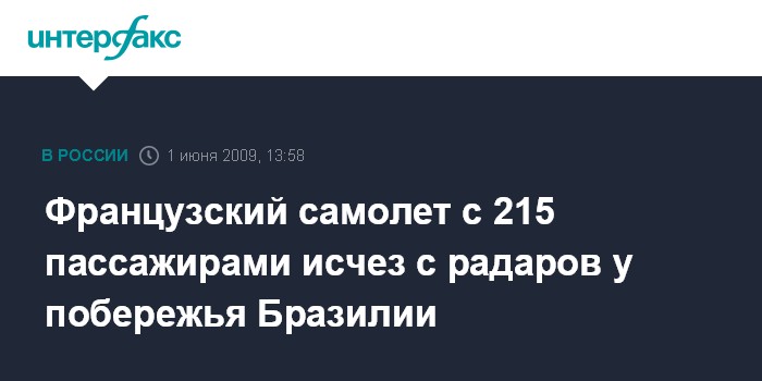 Париж. 1 июня. INTERFAX.Ru - Лайнер Airbus авиакомпании "Air France", выполняющий рейс Рио-де-Жанейро - Париж, в понедельник исчез с радаров у побережья Бразилии, сообщают представители авиационных властей Франции.