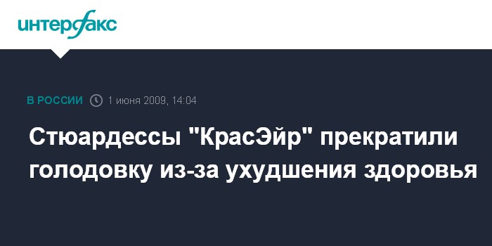 Красноярск. 1 июня. INTERFAX.RU - Бортпроводницы авиакомпании ОАО "Красноярские авиалинии" ("КрасЭйр"), требовавшие полного погашения многомесячных долгов по зарплате, прекратили голодовку, длившуюся около 19 суток.